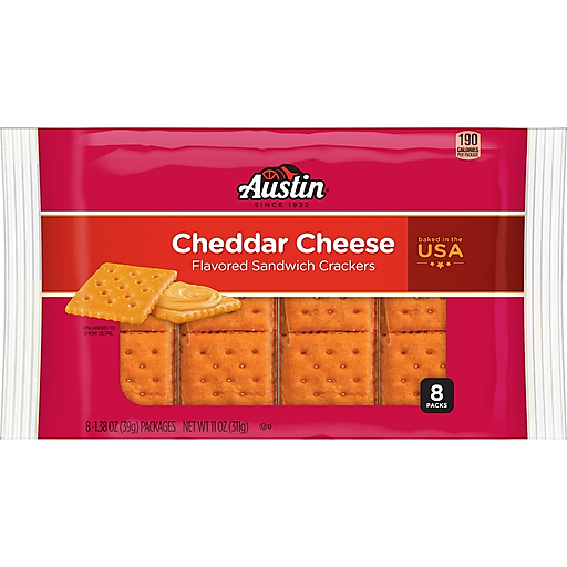 Add a cheesy flavor boost to any snacking moment with Austin Cheddar Cheese Flavored sandwich crackers. These crispy, cheese-tastic sandwich crackers are made with an irresistible creamy filling, the craveable taste of cheddar cheese, and a sprinkle of salt. Austin sandwich crackers provide snacking satisfaction for any occasion, whether you're just hanging out around the house or preparing to head out for a busy afternoon; Take them along with you to outdoor concerts, hiking, or camping, or enjoy during game time. Our crackers are conveniently packaged to fit your non-stop lifestyle, making it easier than ever to pack a snack for all kinds of busy, on the go moments. Feel free to add some crackers to a packed lunch, stash them in your tote for a well-deserved break at work, enjoy them during a long commute, or as an effortless snack while running errands. Enjoy the big, cheesy taste of Austin Cheddar Cheese Flavored sandwich crackers. Baked in the USA.
