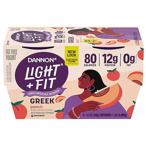 Looking for a delicious fat free yogurt with crave-able peach flavor? Give your taste buds a reason to rejoice with a four-pack of Dannon Light + Fit Peach Greek Fat Free Yogurt Cups. Every bite of this Peach flavored yogurt makes it easy to enjoy fat free snacks with this delicious light yogurt brand*. At Light + Fit, our goal is to help you do you by serving up some delightfully creamy Greek yogurt with sensational flavor. Our fat free Greek yogurt comes in single-serve cups, so you can live your life uninterrupted and enjoy them on the go. Protein is an essential nutrient we need in our diets, and with 80 calories and 12g of protein per 5.3 ounce serving, this Light + Fit yogurt is a deliciously satisfying and convenient option for adding complete protein every day. Pack a cup and enjoy it as a snack cup at work or as a late-night snack. Add a 5.3 oz yogurt cup to your breakfast parfaits and smoothies or use some in your favorite recipes as a flavorful substitute for baking ingredients. Plus, these Peach flavored 5.3 oz yogurt cups are perfect to enjoy as a protein-rich dessert or treat for any time. Add flavor to your day, every day, with a single serving snack cup of Dannon Light + Fit Peach Greek Fat Free Yogurt. *At least 50% less fat than average flavored Greek yogurt; Light & Fit: 80 calories, 0g fat; Average flavored Greek yogurt: 110 calories, 1g fat per 5.3 oz serving. **Consult your Healthcare Professional to learn how Light & Fit Greek yogurt can be included as part of a balanced diet.