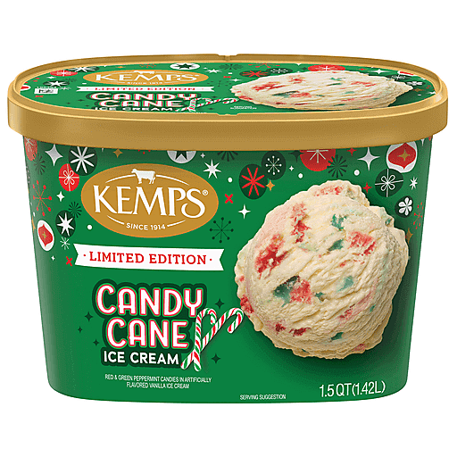For a limited time, indulge your holiday craving with a bowl of Kemps Candy Cane Ice Cream. Our Candy Cane Ice Cream delivers red and green peppermint candies in artificially flavored vanilla ice cream that the whole family will love. Enjoy this delicious ice cream by the scoop with a cone, in a bowl with all your favorite sundae toppings, or as a side with your favorite dessert. With so much of this yummy ice cream to share, Kemps Candy Cane Ice Cream is perfect for your next sweet treat! Since 1914, Kemps has been delighting families throughout the upper Midwest with wholesome and delicious dairy products. Farmer owned. Family loved.