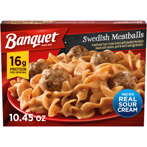 Banquet Swedish Meatballs frozen meal brings the home-cooked flavor to your table in minutes. This frozen dinner features traditional sour cream gravy with Swedish meatballs and egg noodles for delicious ready made meals. Enjoy Banquet frozen meals as convenient frozen lunches, or quick dinners when you're in the mood for meatballs and noodles. Preparation of frozen prepared meals is quick and easy. Follow the instructions on the package to prepare frozen dinners in the oven for fresh-baked taste or microwave for a quicker cook time. Store the 10.45 ounce frozen meatballs and noodles meal in the freezer until you’re ready to enjoy frozen entrees. in the U.S.A. for over 60 years, Banquet has been making delicious food the whole family loves.