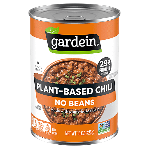 Enjoy the taste and texture of beef chili without the meat, with Gardein Plant-Based Chili With No Beans. Delicious Gardein plant-based be'f crumbles combined with tomatoes and a bold spice blend make up this flavorful vegan canned chili. It is Non-GMO Project Verified, contains no artificial flavors, preservatives or dyes* and provides 29 grams of protein per serving. Stock your pantry with this ready-to-eat, microwavable meal for quick and easy chili anytime; add additional ingredients for your own spin on this tasty vegan chili. Great for college snacks or an instant meal. Gardein: Your Favorite Foods Made Meatless.