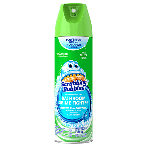 Scrubbing Bubbles Bathroom Grime Fighter Aerosol is a multisurface household disinfectant spray with a penetrating foam that takes on grime wherever it hides and kills 99.9% of viruses^ and bacteria*. With this all-purpose cleaner a clean bathroom is only a spray away. Bathroom Grime Fighter Aerosol is best for cleaning large bathroom spaces—like the bathtub or shower—and in hard-to-reach places like between tile and around fixtures. This 100% soap scum remover also delivers an amazing fragrance. Grime Fighter is an effective tile cleaner, sink cleaner, bathtub and shower cleaner, as well as an overall bathroom cleaner. This disinfectant cleaner is an easy way to get tough on bathroom surface messes. This disinfectant is also available in the following scents: Citrus, Floral Fusion and Rainshower, as well as an adjustable trigger spray. When used as directed, kills: ^Herpes Simplex Virus Type 1, Herpes Simplex Virus Type 2, Influenza A (H1N1) Virus, Respiratory Syncytial Virus, Rotavirus. *Staphylococcus aureus (Staph), Salmonella enterica (Salmonella), Pseudomonas aeruginosa, Escherichia coli 0157: H7 (E. coli), Listeria monocytogenes.