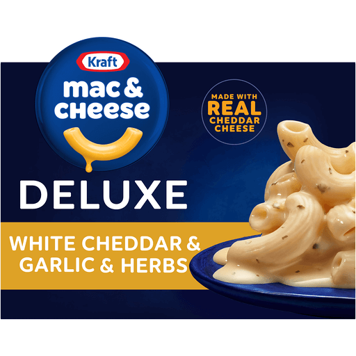 No artificial flavors. No artificial dyes. Per 3 oz Serving: 270 calories; 2.5 g sat fat (13% DV); 700 mg sodium (29% DV); 5 g sugars. Made with real cheese. Good news! 10 g protein per serving. 15% DV (Percent Daily Values are based on a 2,000 calorie diet. Your daily values may be higher or lower depending on your calorie needs) of calcium. See nutrition information for sodium content. For more recipes please visit us at www.Kraftrecipes.com. Deluxe taste you know you'll love. The real white cheddar cheese you love smothered with garlic and herbs. It's easy. It's cheesy. It's herby and creamy. Hearty cavatappi pasta lets you enjoy more cheese with every bite. This product is sold by weight, not volume. Some settling of contents may have occurred during handling. Visit us at: Kraftheinzcompany.com or call us at: 1-800-847-1997. The carton is 100% recyclable. Carton made from 100% recycled fibers. Minimum 35% post-consumer content. Recycling programs for this package may not exist in your area.