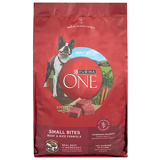 Deliver proven nutrition to your small-breed dog with Purina ONE Small Bites Beef and Rice Formula Dry Dog Food Natural With Added Vitamins, Minerals and Nutrients. The small, easy-to-eat, tender, crunchy morsels of dog kibble offer a high protein dog food dogs love, and real beef as the number one ingredient lets you feel good about the food you feed your smaller dog. This formula supports healthy skin and a shiny coat and is highly digestible, so more nutrition goes to work inside your dog. Included is prebiotic fiber for dogs to nourish gut health and zero fillers, so every high-quality ingredient has a purpose. Each Purina ONE adult dog food serving is packed with protein to help support strong muscles, including a healthy heart, and natural sources of glucosamine for dogs to support joint health and an active lifestyle. Give your dog smart nutrition with this nutrient-dense Purina ONE dry dog food.