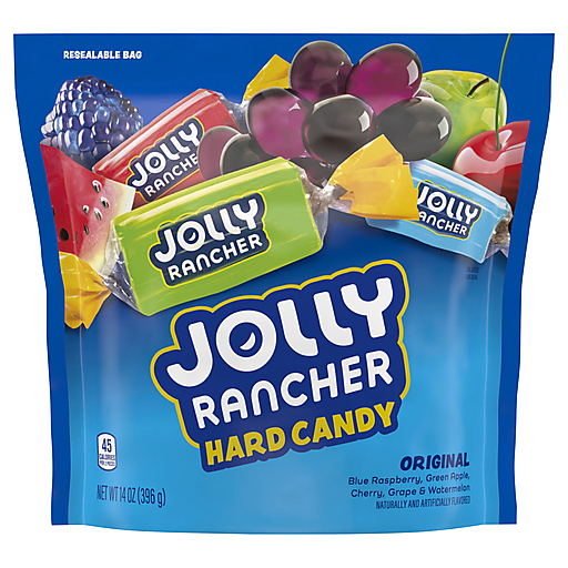 A mix of five fruity favorites for the whole family in just one bag of hard candy? You wouldn't have thought it possible if you didn't know JOLLY RANCHER candy. This stand-up bag of individually wrapped fruit flavored hard candy is resealable, so you can keep each delicious piece fresh until it's time to open a new bag. Featuring blue raspberry, green apple, cherry, grape and watermelon flavors, JOLLY RANCHER original hard candy offers a combination of the undisputed classics you know and love. Keep this convenient resealable bag with you on the go so you can share with friends, co-workers and family members throughout the day — but don't forget to save some for yourself during all that sharing! These fruit candies make the perfect candy bowl display all year thanks to vibrant colors and attractive JOLLY RANCHER wrappers. They're also great treats for stuffing holiday stockings, filling Easter baskets, creating Valentine's Day party favors and filling Halloween trick-or-treat bags and candy bowls. If you want a small candy with a big taste to keep your taste buds busy during movie nights, road trips, lunch breaks and snack breaks, JOLLY RANCHER hard candy is the perfect sweet treat for you.
