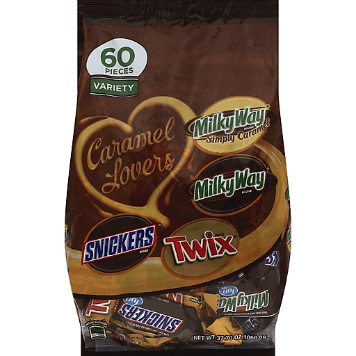Milky Way Brand Simply Caramel. Milky Way Brand. Snickers Brand. Twix Brand. What's Inside: 80 to 100 calories (4% to 5% DV) per pack. Real chocolate. Milk Way Brand Fun Size Bars: What's Inside - Per Fun Size Pack: 80 calories (4% DV); 3 g total fat (5% DV); 2 g sat. fat (10% DV); 10 g sugars (No DV defined); 25 mg sodium (1% DV). Milky Way Brand Fun Size Simply Caramel Bars: What's Inside - Per Fun Size Pack: 100 calories (5% DV); 4.5 g total fat (7% DV); 3 g sat. fat (15% DV); 13 g sugars (No DV defined); 25 mg sodium (1% DV). Snickers Brand Fun Size Bars: What's Inside - Per Fun Size Pack: 80 calories (4% DV); 4 g total fat (6% DV); 1.5 g sat. fat (8% DV); 9 g sugars (No DV defined); 40 mg sodium (2% DV). Twix Brand Fun Size Bars: What's Inside - Per Fun Size Pack: 80 calories (4% DV); 4 g total fat (6% DV); 2 g sat. fat (10% DV); 8 g sugars (No DV defined); 30 mg sodium (1% DV). GDA's are based on a 2,000 calorie diet. To learn more visit www.marshealthyliving.com. We value your questions or comments. Call 1-800-651-2564. Please save the unused product and wrapper.
