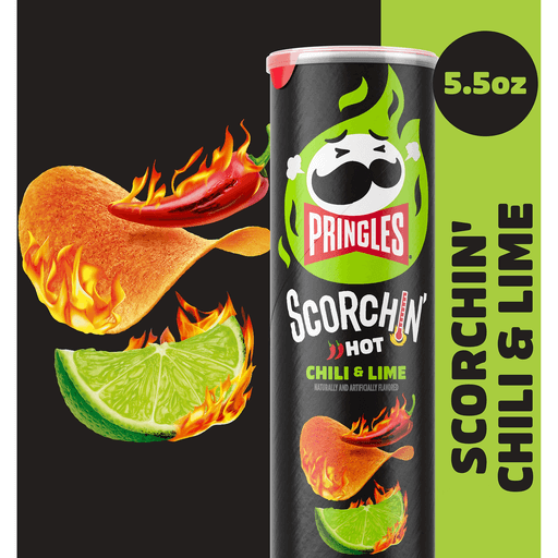Pringles Scorchin' Chili and Lime potato crisps chips packs the perfect balance of flavor and heat. With the tantalizing crunch of potato, spicy chili, and smooth lime all combined for a fiery blaze, it's a snack you can keep eating, and eating, and eating, and...eating. Rated hot on the Pringles' heat scale for a kick of heat from edge to edge, these shareable cans make it easy to create snacking moments wherever and whenever; Bring a can for game night with family and friends, or sit back, relax and game-on with this spicy snack that turns up the temperature. Stash a can in your backpack, stock up your pantry or take one in the car to enjoy anytime. Crave the uncomfortable with Pringles Scorchin' Chili and Lime potato crisps chips.