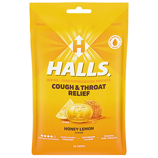 HALLS Relief Honey Lemon Cough Drops are ready for whatever life throws, or coughs, your way. With 7.5 mg of menthol per drop, these throat lozenges relieve coughs, soothe sore throats and cool nasal passages to relieve your worst symptoms. This effective cough suppressant comes in a refreshing yet soothing honey lemon flavor. Whether you're using HALLS cough drops for sore throat relief, cough relief or as an oral anesthetic, simply dissolve one drop in your mouth slowly, and repeat every two hours as needed. HALLS Relief cough drops are formulated for adults and children five years and older. This bag holds 30 individually wrapped drops and is resealable, making it ideal for stowing in your travel pack, purse or desk drawer. These packs are also perfect inclusions in a healthy gift or care package.