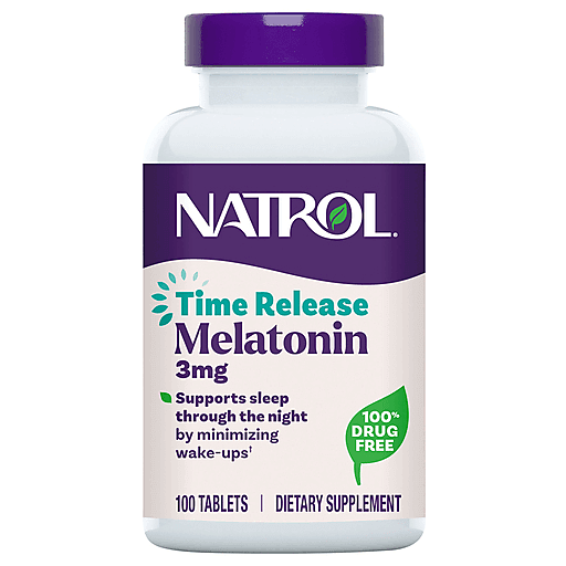 NATROL 3 MG. TIME RELEASE MELATONIN HELPS YOU FALL ASLEEP FASTER AND STAY ASLEEP LONGER WITH OUR TWO-LAYER TIME RELEASE TABLETS. OUR PRESERVATIVE-FREE SLEEP AID IS 100% DRUG-FREE AND HELPS ESTABLISH NORMAL SLEEP PATTERNS. OUR SUPPLEMENT ALSO CONTAINS VITAMIN B-6. EACH BOTTLE OF MELATONIN CONTAINS 100 VEGETARIAN TABLETS.