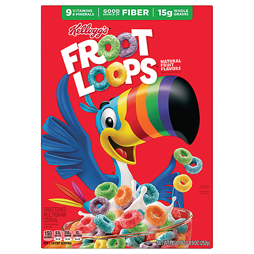 Follow your nose to delicious bursts of fruity flavor in Kellogg's Froot Loops sweetened multi-grain breakfast cereal. Dig into vibrant, colorful crunchy O's made with tasty, natural fruit flavors and grains as the first ingredient. It's like a rainbow in every bowl. Fun to eat for adults and kids, this low-fat, healthy cereal is a good source of 9 vitamins and minerals per serving; The entire family can enjoy a bowl with milk or a dairy alternative in the morning, afternoon or as a late-night treat. Enjoy sweet cereal milk after a delicious bowl of Froot Loops cereal. Perfect for snacking by the handful at work, as a school snack, in the car, and simply on the go. Always have this sweet cereal handy, add fruity goodness to any lunch box, tote bag, or backpack. Any time you want to include a flavorful pick-me-up in your day, reach for a box of Kellogg's Froot Loops cereal.