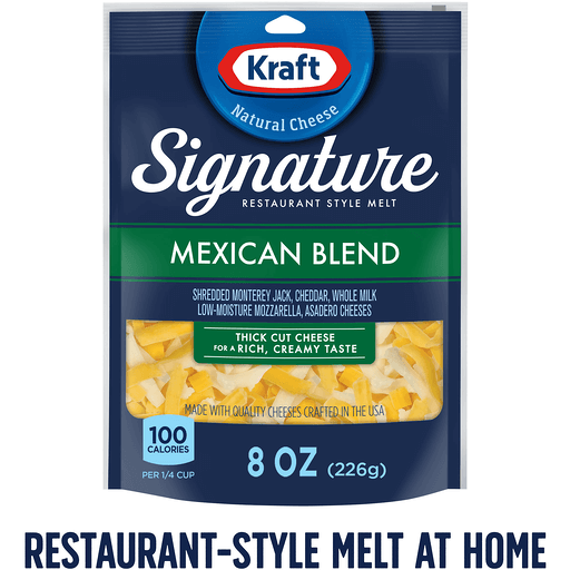Since 1904, the Kraft brand has been trusted and adored by cheese lovers across the country. And new Kraft Signature shreds are the latest innovation that people can't wait to get their hands on. Made with quality natural cheeses in the USA, Kraft Signature Mexican Blend combines delicious Monterey Jack, savory Cheddar, and traditional Asadero cheese with whole milk, low-moisture Mozzarella for a rich, creamy taste.