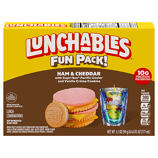 Have fun with lunch! Lunchables Ham & Cheddar with Capri Sun Pacific Cooler and Vanilla Creme Cookies Fun Pack! lets kids eat it their way — no prep needed! Each 3.5 ounce tray contains ham with water and smoke flavor added and cheddar pasteurized prepared cheese product that are perfectly paired with buttery, flaky crackers featuring the perfect combo of salty and sweet flavor. For a tasty treat, enjoy delicious vanilla sandwich cookies with smooth, velvety creme filling, crafted exclusively for our Lunchables kits. Sip on a 6 fl oz pouch of Capri Sun Pacific Cooler mixed fruit flavored juice drink blend from concentrate. Packed with protein and fun in every bite, each serving contains 10 grams of protein. Our Lunchables Fun Pack! tastes great and is perfect as part of school lunches, weekend bites or any time hunger strikes. The real win is that kids get to make it and eat it their way! Keep Lunchables refrigerated until you're ready to enjoy.