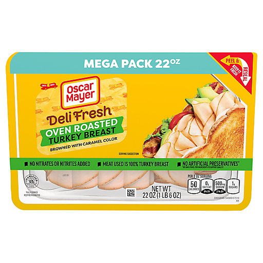 Make a delicious deli sandwich at home with Oscar Mayer Deli Fresh Oven Roasted Turkey Breast Sliced Lunch Meat. Our quality turkey deli meat is made with no artificial preservatives* and no added nitrates or nitrites. *See ingredient line for ingredients to support quality. Fully cooked and ready to eat, our turkey slices have a rich, classic turkey flavor that's perfect for a sandwich, salad, or cheese and crackers. Keep our mega pack 22-ounce package of deli turkey refrigerated to maintain freshness. If you enjoy our oven roasted deli turkey, be sure to try the other varieties of Oscar Mayer turkey lunch meat.
