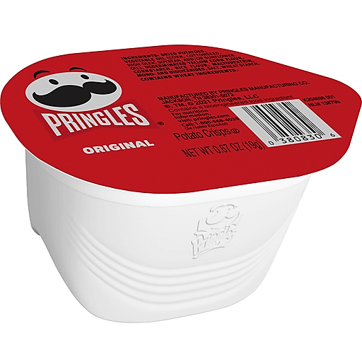 What comes after opening this pack of portable Pringles Potato Crisps? The crisp, tantalizing taste of potato that hits the spot every time. These ingeniously shaped Pringles Original Potato Crisps are insanely light, crispy and never greasy and each crisp is satisfyingly salty. With this convenient, individual-size cup, it's easy to create your own snacking moments wherever and whenever you want. Grab a cup as a pick-me-up for after school or pack into lunch boxes; Bring a cup for game time plus some for other Pringles fans. Stash cups in your work desk or pantry to enjoy anytime. Share Pringles at your next get-together to turn up excitement among family and friends. Get your hands on Pringles Original Potato Crisps for awesomeness that keeps you coming back, stack after stack.