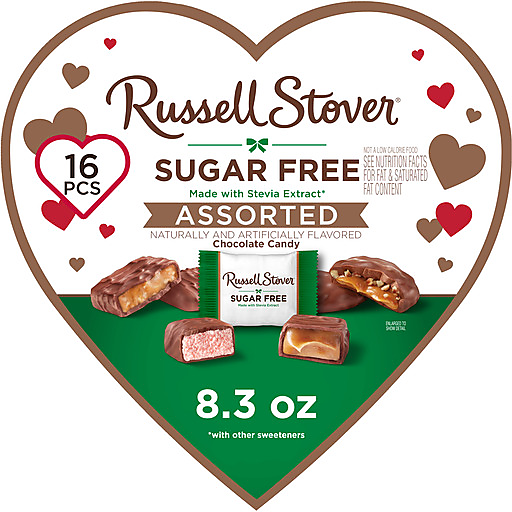 RUSSELL STOVER Valentine's Day Sugar Free Assorted Chocolate Candy Heart Gift Box, 8.3 oz., contains about 16 individually wrapped pieces of 4 sugar-free chocolate candy favorites: Caramel, Pecan Delight, Toffee and Strawberry Flavored Crème. Made with Stevia extract, a plant-based sweetener that delivers the taste and tradition you remember with zero sugar. A thoughtful gift of America's Favorite Sugar Free Candy! No Sugar, Great Taste = Guaranteed. Share the love with RUSSELL STOVER - an American-made classic since 1923. Made from our hearts with tradition and passion, we are proud to be part of your sweet traditions and everyday indulgences.