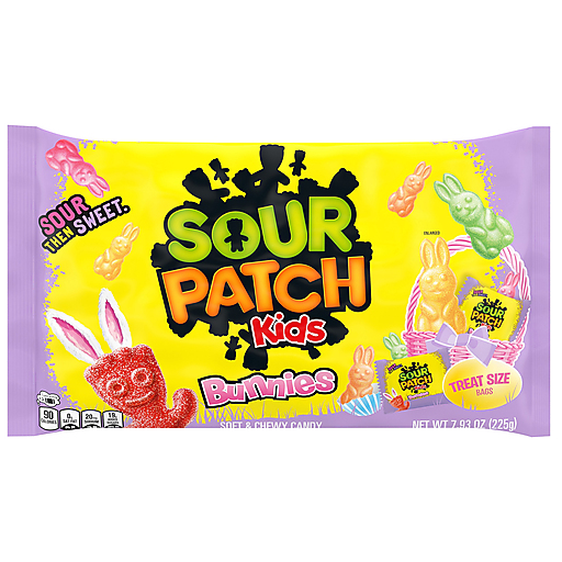 SOUR PATCH KIDS Bunnies Soft & Chewy Easter Candy is a tasty way to add a little mischief to your Easter celebrations. Each Easter candy pack contains chewy candy in mouth-puckering assorted fruit flavors that create a SOUR THEN SWEET treat to satisfy your taste buds. The unique bunny candy shapes add a little fun to your Easter candy gifts. A fat-free food, this soft candy makes a great sweet treat for multiple occasions. Keep SOUR PATCH KIDS sour gummy snacks on hand for Easter egg hunts, Easter basket candy or Easter egg fillers. This bagged candy is also great for Easter party favors and candy exchanges. These treat-size candy bags are great for gifting or sharing amongst friends on Easter egg hunts, as Easter fillers, or for lunchboxes. Stay stocked with bulk Easter candy so you're ready to fill all of your Easter baskets.