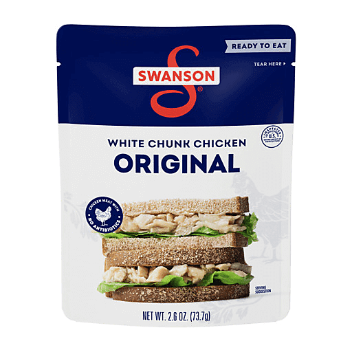 Experience the ultimate in convenience and flavor with Swanson® Original White Chunk Fully Cooked Chicken - the perfect solution for easy, protein-rich meals that satisfy your cravings and fuel your day. Living up to Swanson’s tradition of simple ingredients, our tender chunks of diced chicken breast contain no antibiotics or added MSG. This premium white chicken is 97% fat-free, gluten-free and has 12 grams of protein in each 2.6-ounce serving. The easy-to-open pouch of precooked chicken is ready to enjoy with no need to drain, allowing you to indulge in a matter of seconds without any hassle. Each 2.6-ounce pouch contains 1 serving of precooked chicken chunks. Enjoy it with a hearty chicken salad, a flavorful sandwich, or as a quick snack with crackers. Swanson® Original White Chunk Fully Cooked Chicken Pouches allow you to enjoy quick and satisfying chicken meals wherever you are, making them perfect for busy individuals and outdoor enthusiasts.