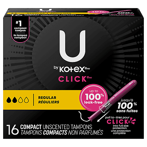 Get up to 100% leak-free protection and stay confident throughout your day with U by Kotex Click Compact Tampons! Made without fragrance, Click tampons for women are designed for your comfort and have a smooth tip for easy and comfortable insertion. Each tampon features ComfortFlex grooves that move with y ou for outstanding comfort. Try U by Kotex Click Tampons and see why the #1 compact tampon* is chosen by women every 1.9 seconds. Pocket-sized and small enough to carry in your purse or pocket, these tampons go from compact to a full-size tampon in one easy step giving you comfortably compact, powerful protection. Pull the lower half of the tampon and when it locks in place, it’s ready to go! U by Kotex Click Compact Tampons are available in regular, super and super plus absorbencies. For backup period protection, try U by Kotex Barely There Pantiliners. U by Kotex feminine products are FSA/HSA/HRA-eligible in the U.S. Packaging may vary from images shown.*Based on sales data**Among those with a preference