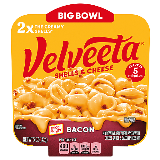 Shell yeah! Live life to the creamiest with Velveeta Shells & Cheese with Bacon and 2X the Creamy Pasta Shells Big Bowl. When your drip is as smooth as ours, you don’t waste time when it comes to delicious indulgence. For instant cheesy gratification, our original recipe hits the mark, with iconic, velvety meltability and tender pasta shells that grip the drip like no other. Made with real bacon bits, Velveeta’s supremely creamy texture and rich, savory taste satisfy your cravings any day of the week. Amp things up by customizing our cheesy bacon pasta with added veggies, toppings or seasonings. Sometimes unnecessary is necessary, so kick back, relax and embrace the flavor. Whether it’s in the form of a snack, side dish or entree, preparing our luxuriously convenient single-serve Velveeta Shells and Cheese is a breeze. Simply peel back the top, remove sauce pouch, add water up to the fill line, microwave for 5 minutes, stir in the liquid gold cheese sauce and enjoy, unapologetically. That’s La Dolce Velveeta!