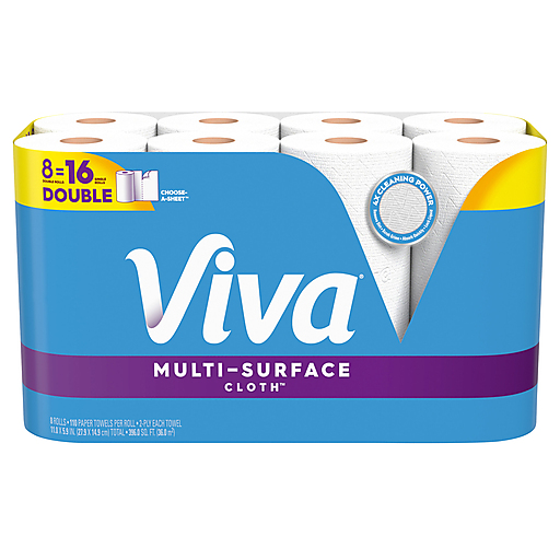 Take care of messes in your kitchen, bathroom, and every room in-between with Viva Multi-Surface Cloth Paper Towels. This pack of Viva paper towels includes 8 double rolls with 110 sheets per roll and features Viva’s Choose-A-Sheet size that lets you choose the right sheet size for your task. Viva Multi-Surface Cloth Paper Towels deliver 4x the cleaning power that removes dirt, scrubs grime, absorbs quickly, and locks liquid for an exceptional, everyday clean. Not only that, but our cloth paper towels trap mess 3x better* and are more absorbent** for a complete clean. Each sheet is made with two layers for sponge-like absorbency and micro-scrubbing technology, which creates a unique texture that lifts and traps mess to deliver an absorbent clean for all surfaces. No matter the task, Viva Multi-Surface Cloth helps leave any surface spotless, including metal, granite, glass, and wood. Plus, Viva Multi-Surface Cloth Paper Towels are FSC-certified with 100% of our fibers sourced from responsibly managed forests. (*when wet vs. our dry towel) (**vs the leading value brand)